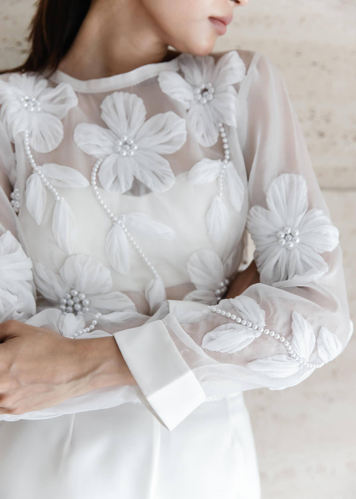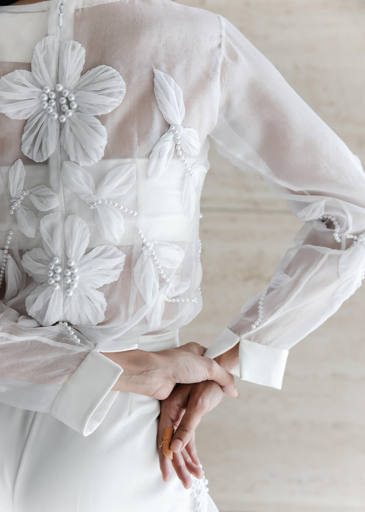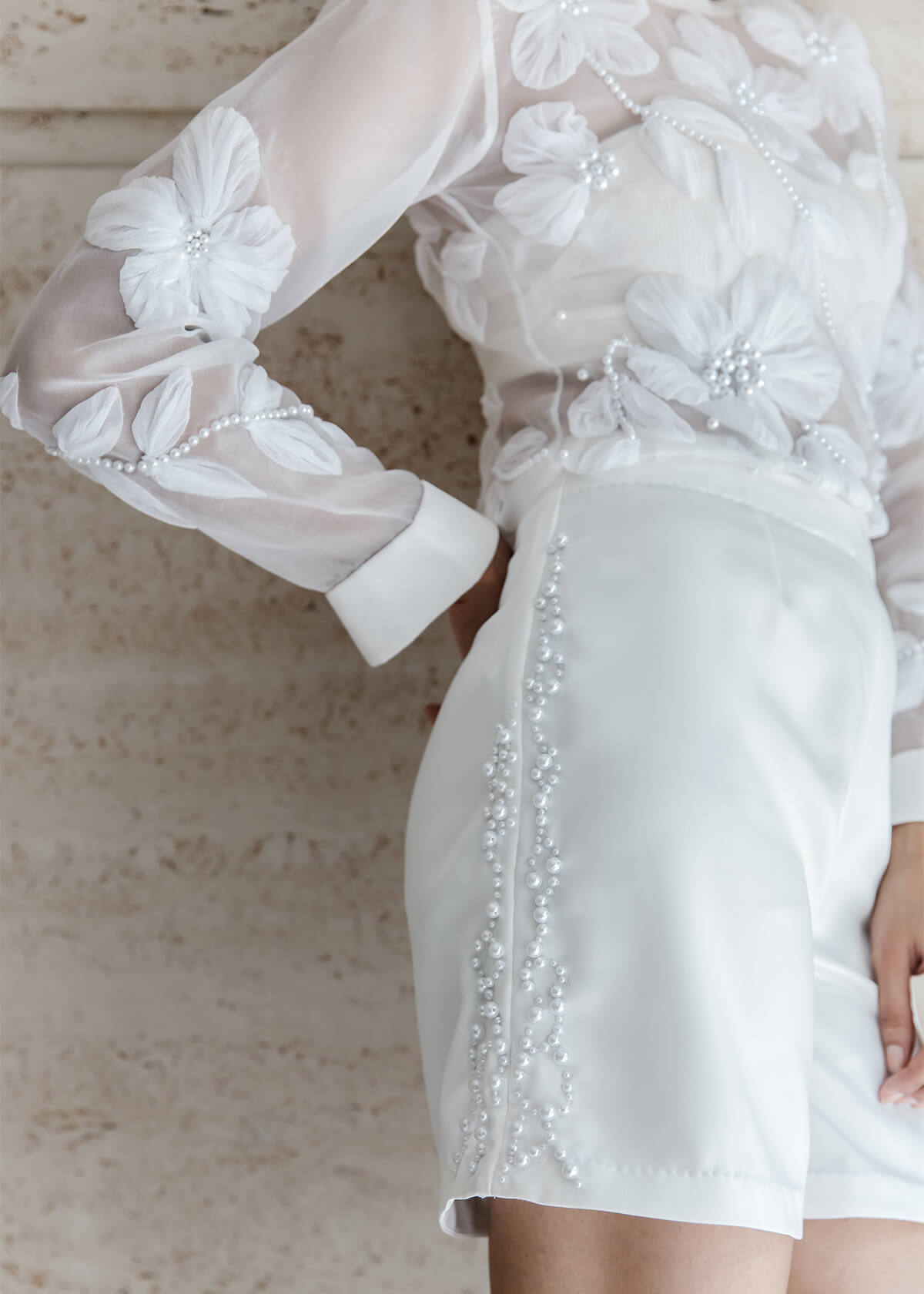 A round-neck, long-sleeve top paired with softly tailored shorts. Featuring botanical embroidery at the chest and waist, trailing into clean lines on the back and shorts.