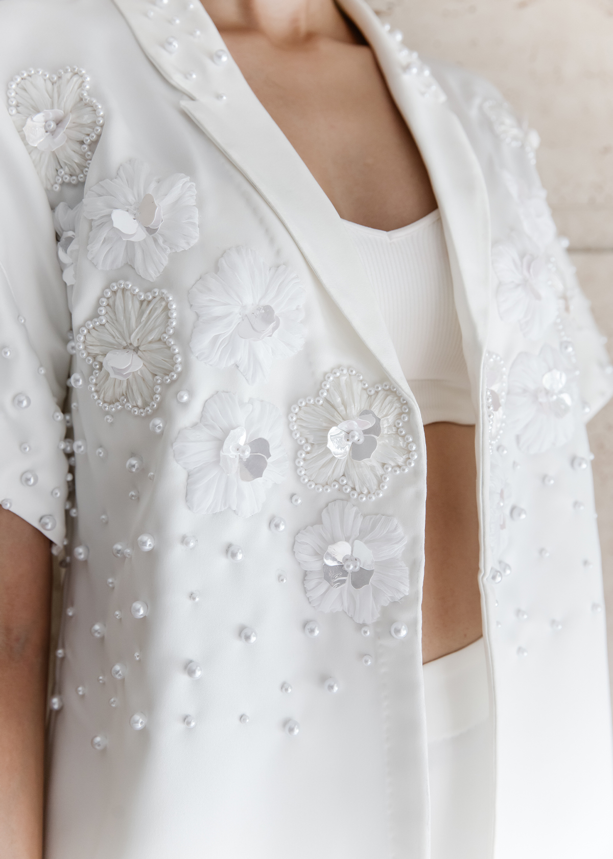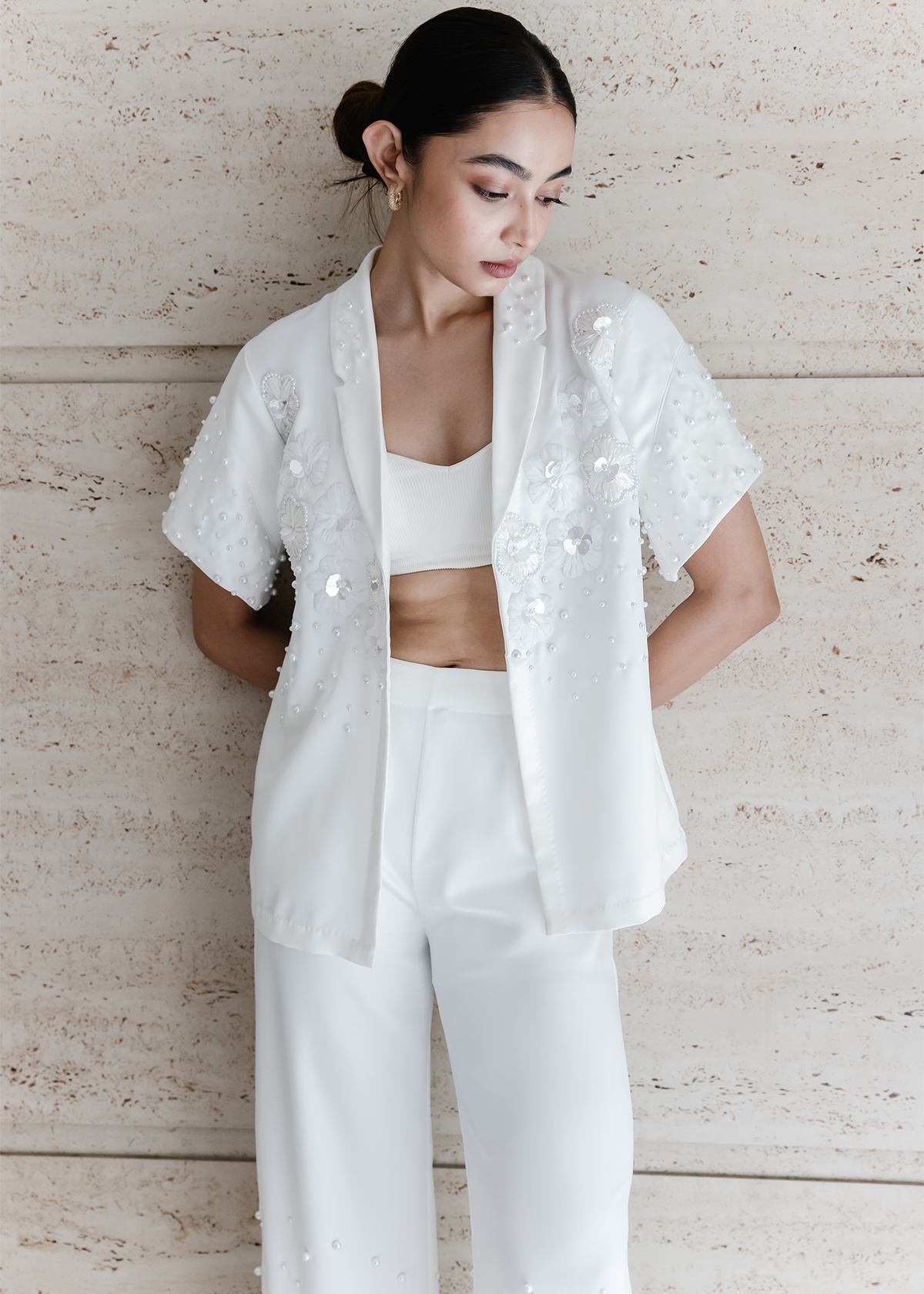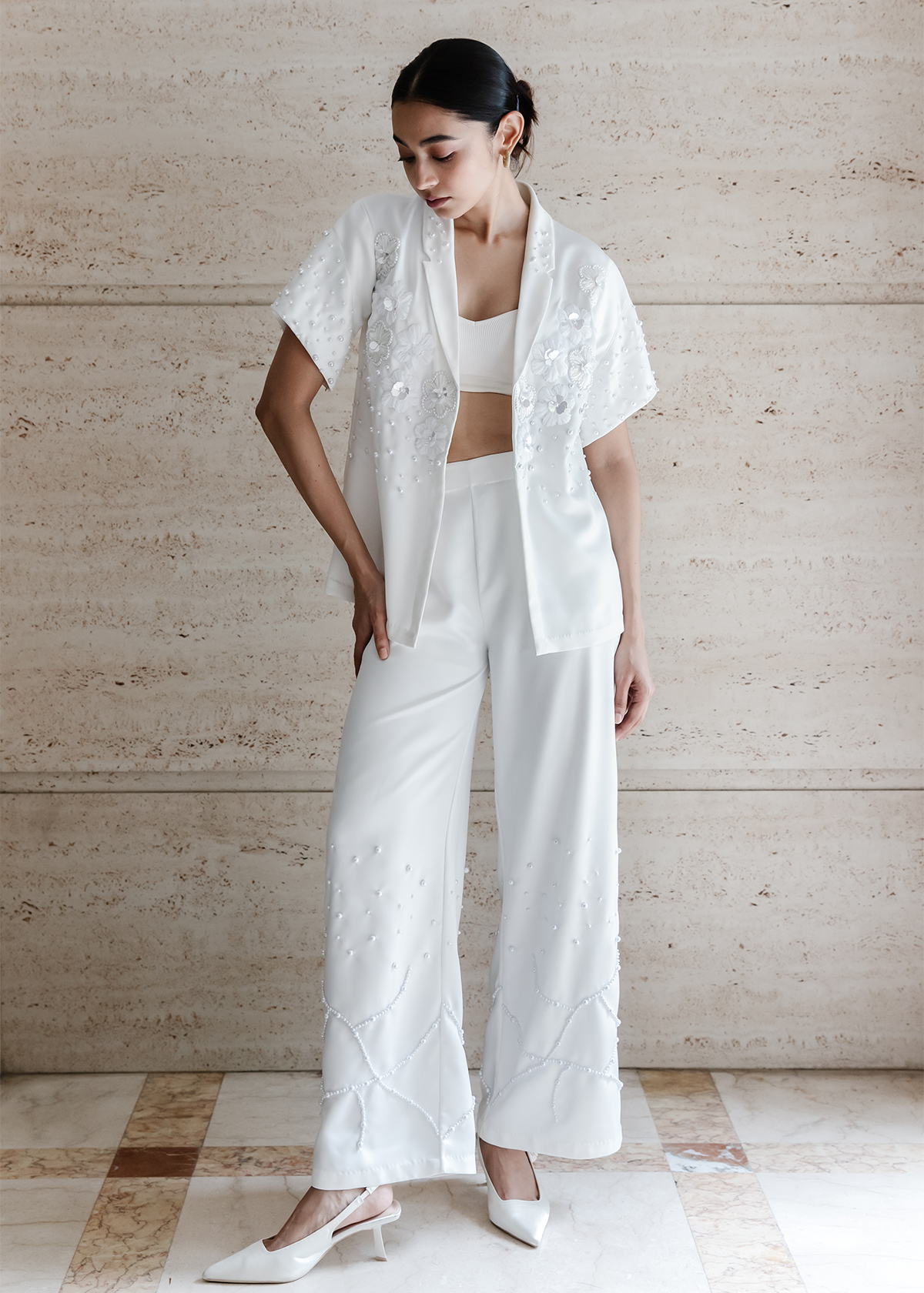 An open short-sleeve shacket with a clean front panel, paired with wide-leg trousers. Embellished with hand-layered florals along the neckline and pearlwork dusting through the sleeve and pant hem.