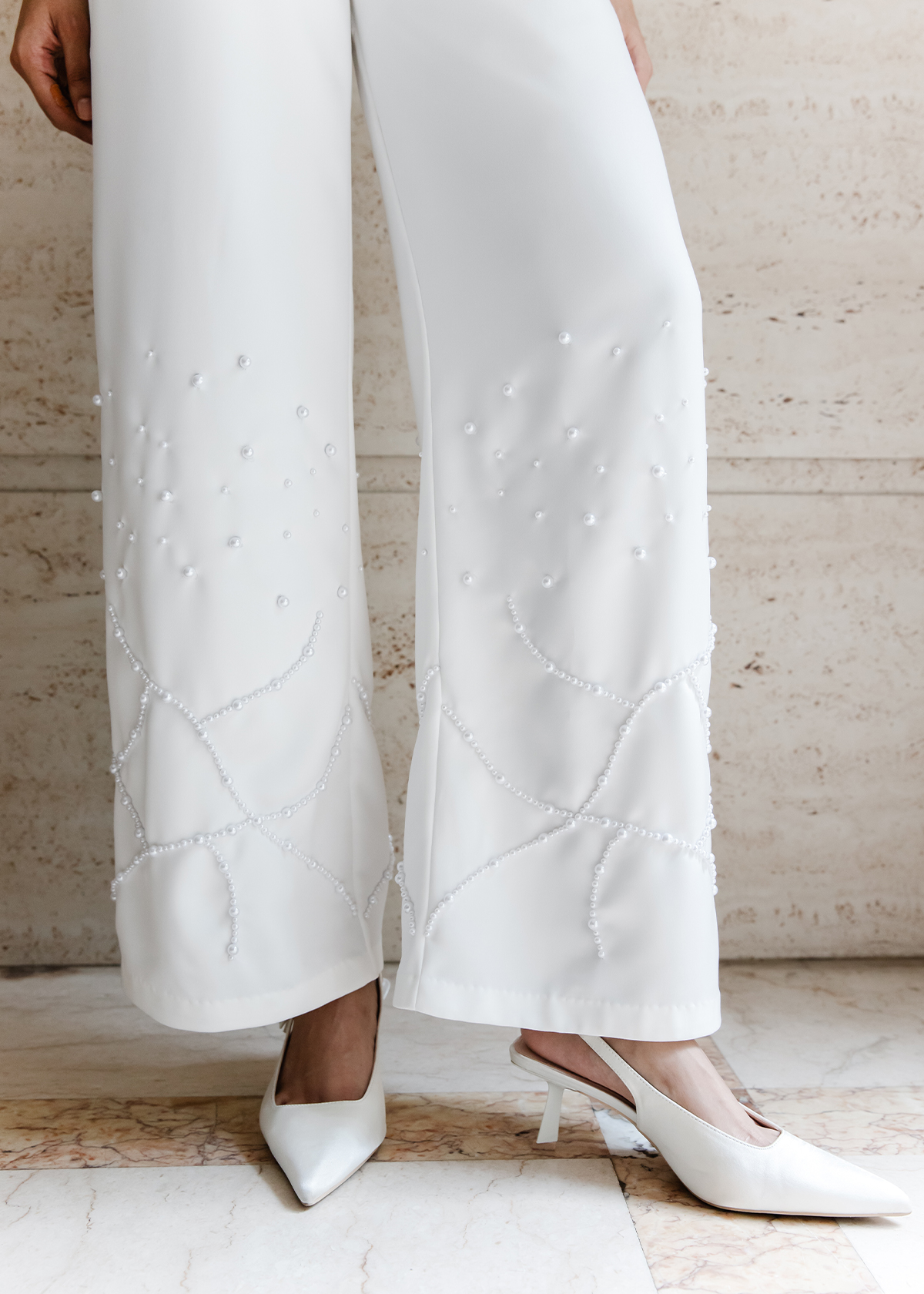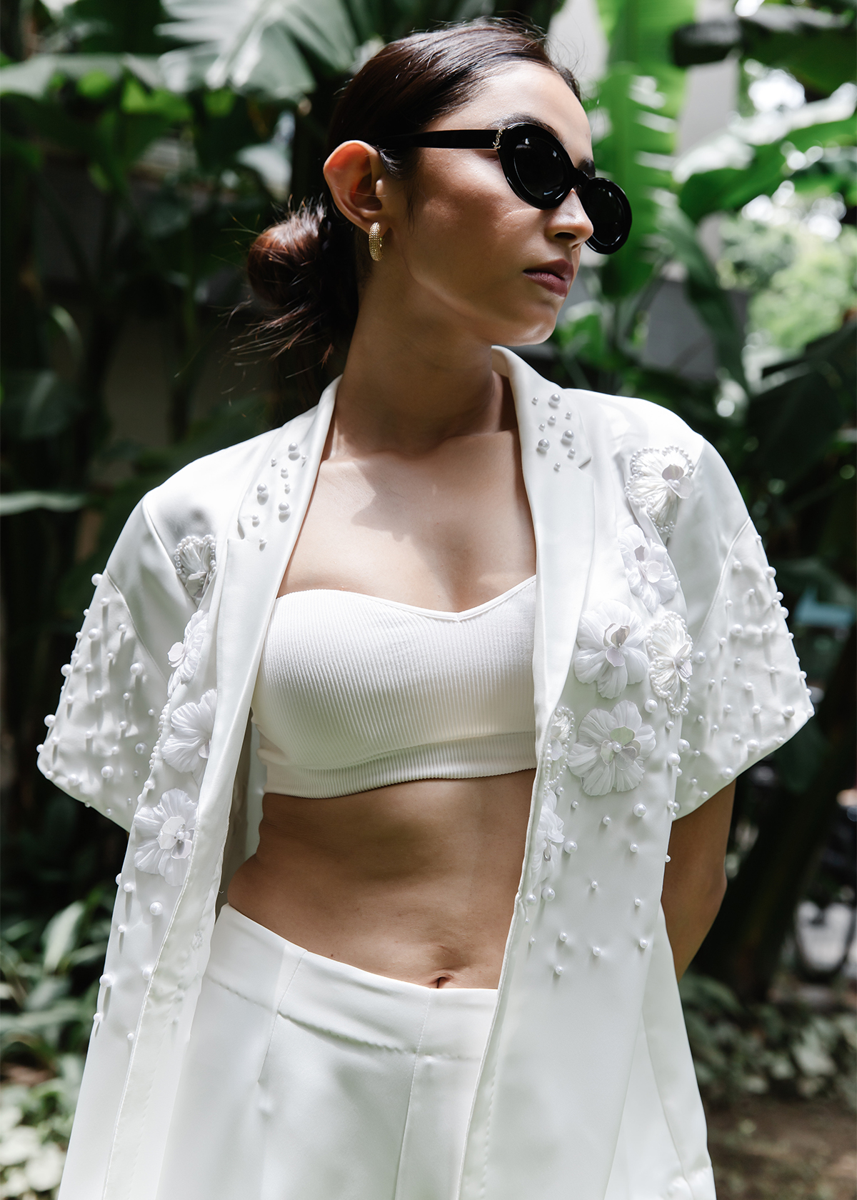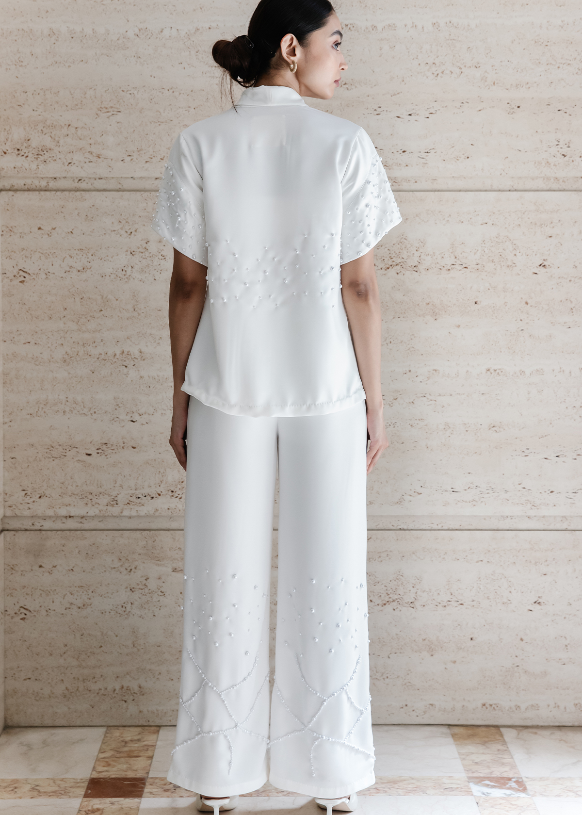 An open short-sleeve shacket with a clean front panel, paired with wide-leg trousers. Embellished with hand-layered florals along the neckline and pearlwork dusting through the sleeve and pant hem.